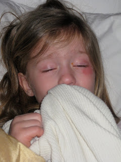 While Izzy was putting on her shoes to leave the house, she managed to poke her eye.