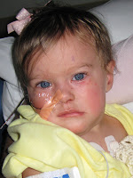 We were told to expect her to be back to herself by this afternoon, but she is far from that. Judging from the 7 hours she has slept today, I think she’s still feeling the sedation. She is most upset about the restraints they have on her arms to keep her from grabbing the probe in her nose. She has developed a fever which has made her heart rate spike and she’s thrown up several times. I think we’re in for a long night. She’s a tummy sleeper (which is covered with EKG lines) and loves to cuddle her blanket (which is impossible in this “straight jacket”).