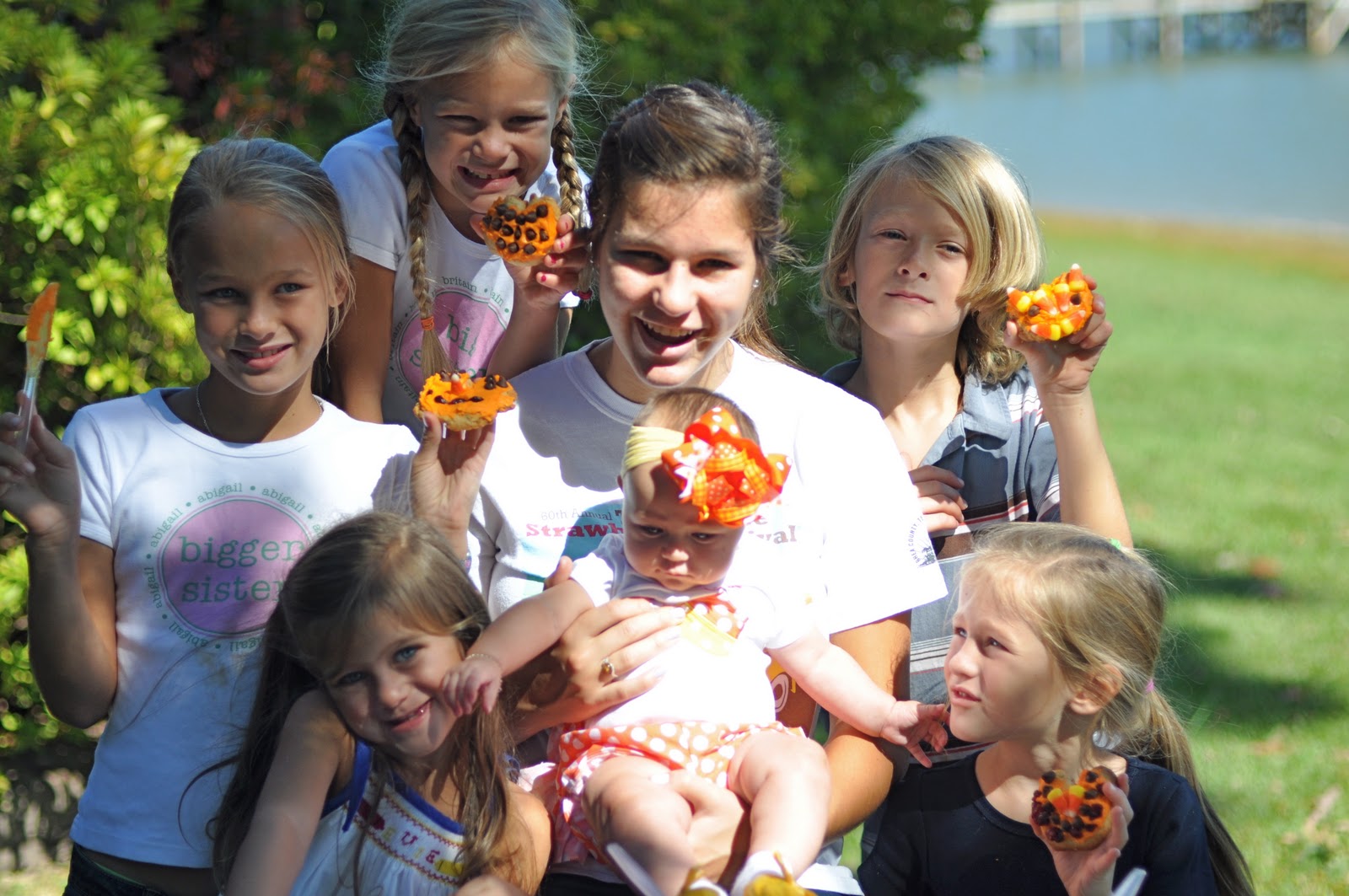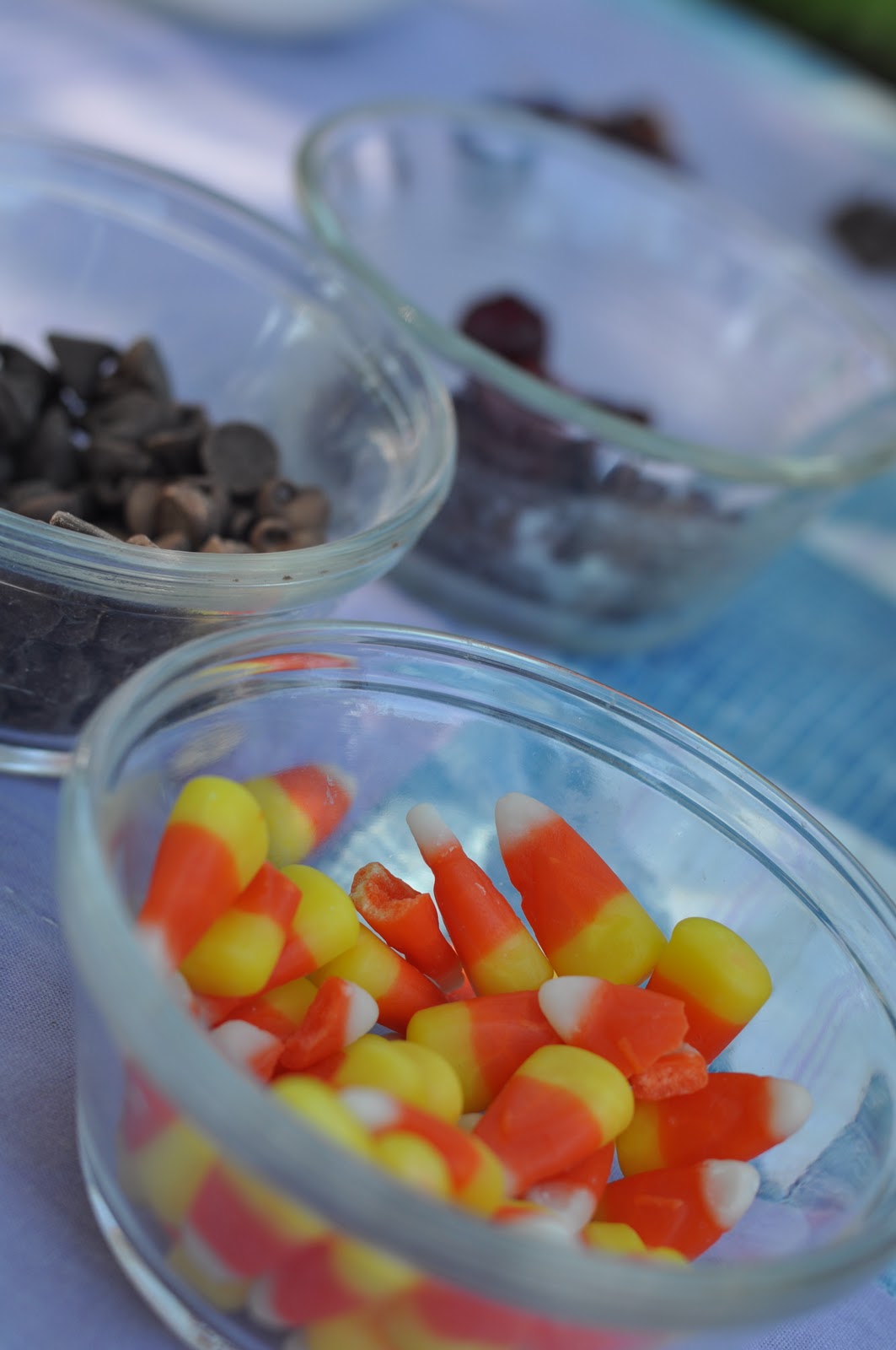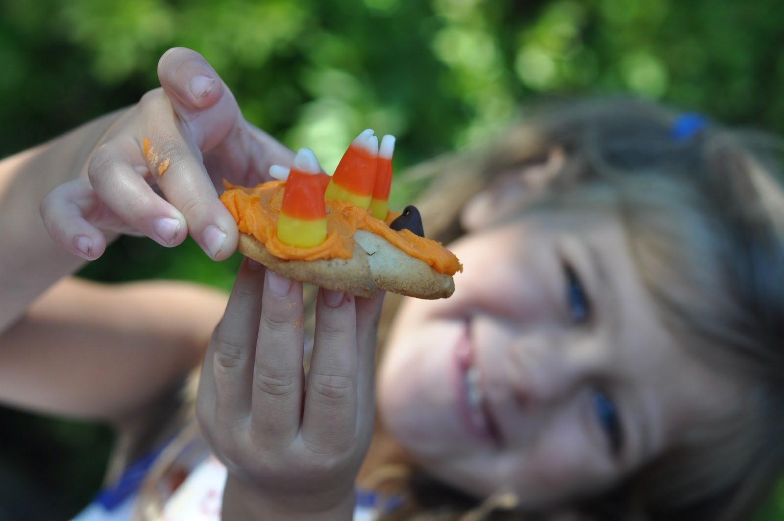 Someday, Ill make them all by myself and they will actually resemble faces rather than explosions of orange frosting peppered with chocolate chips. Izzy proudly held up her pumpkin cookie containing no less than 4 candy corn pieces and 3 even rows of 5 chocolate chips and exclaimed “isn’t he cute?”