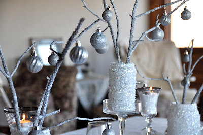 Stage your tablescape over a white tablecloth. I used small silver ornaments from Walmart, but anything you already have could be substituted. Intersperse with white votive candles in wine glasses or crystal condiment dishes. Add a little silver ribbon and some accent baubles, and your finished.