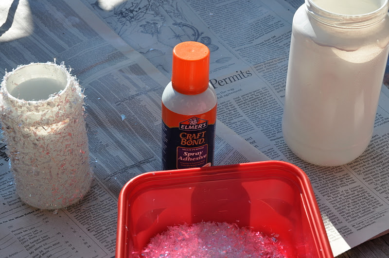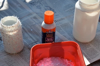 Spray jars coating them with white spray paint. Several white coats will sufficiently cover them. Once they are dry, spray a layer of Craft Bond Spray Adhesive over the entire jar. While still tacky, roll in Frosty Snow glitter.