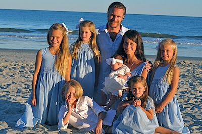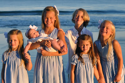 This photo cracks me up. This is what we got after an hour and a half of getting everyone showered, dressed, hair combed, etc……a cranky baby and 5 tired kiddos after 6 hours straight on the beach.