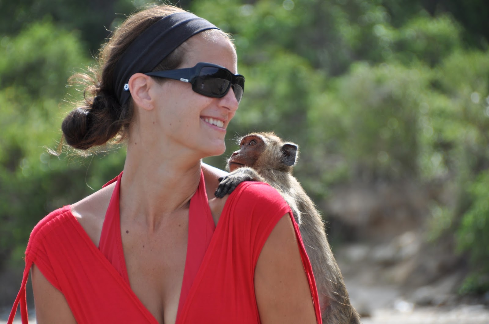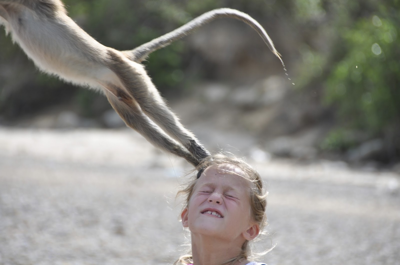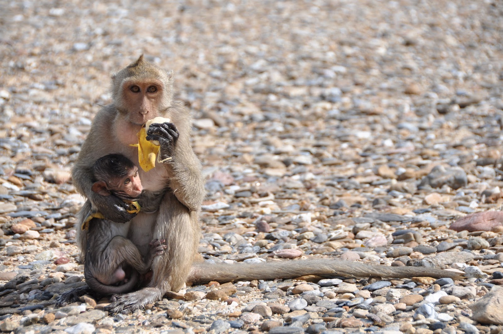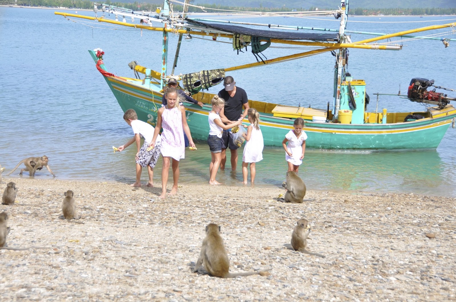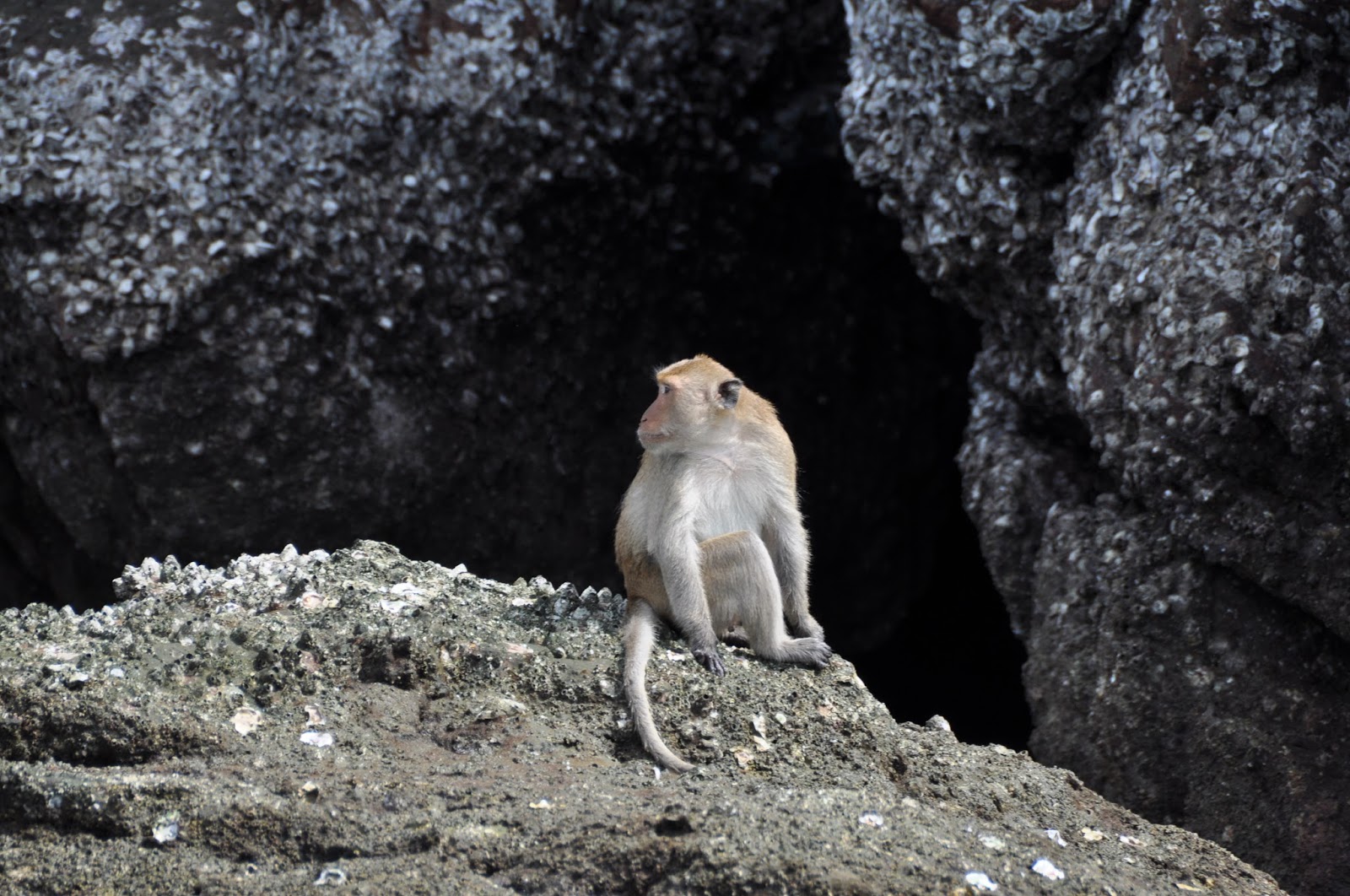 Upon our approach to the island, monkeys began bounding down the rocky ledges and scampering across the beach to meet us.