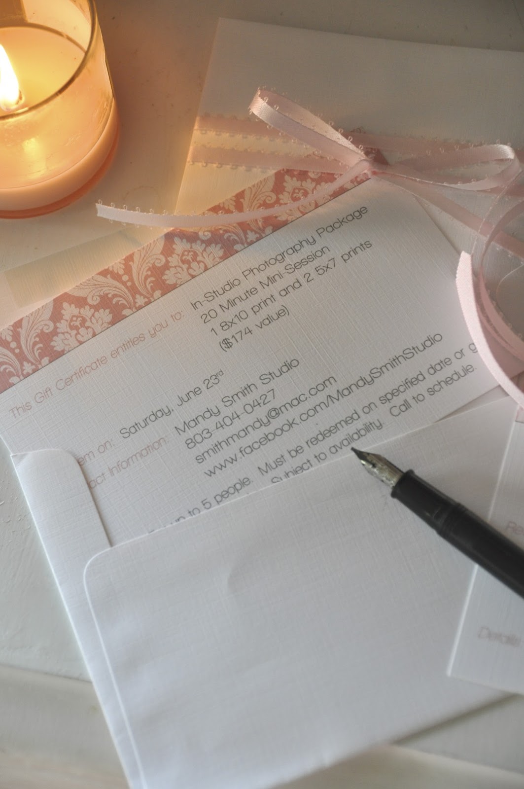 These classy gift certificates are beautifully designed on linen paper.  Double envelopes make them perfect  for “gifting” to a special mom or grandmother.  Beautifully packaged and enclosed with a bow, these make a lovely gift package for mom.  Have the cousins photographed to give prints to Grandma….Or treat the new mom and baby to an intimate moment caught on camera….or memorialize a special season of life with Mother/Daughter photos….can even be used for a maternity mini-session.