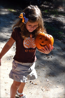 You’ll find this fitting….as Aunt Katherine helped Evie carve her pumpkin, “Miss Priss” insisted that her pumpkin needed a bow! Her creative and obliging auntie did just that. Evie was SO delighted and proceeded to carry her pumpkin around like it was a baby doll!