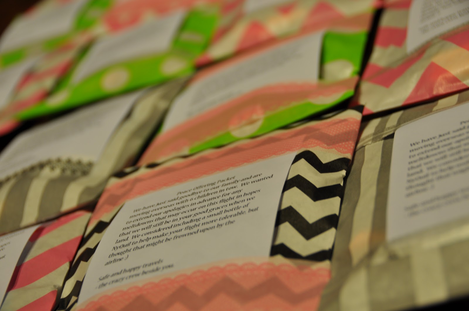 Chad was not nearly as amused with the idea as I was when showed him a huge box with 3 dozen “peace offering packets” that we would be carrying on board to pass out to passengers closest to us.
