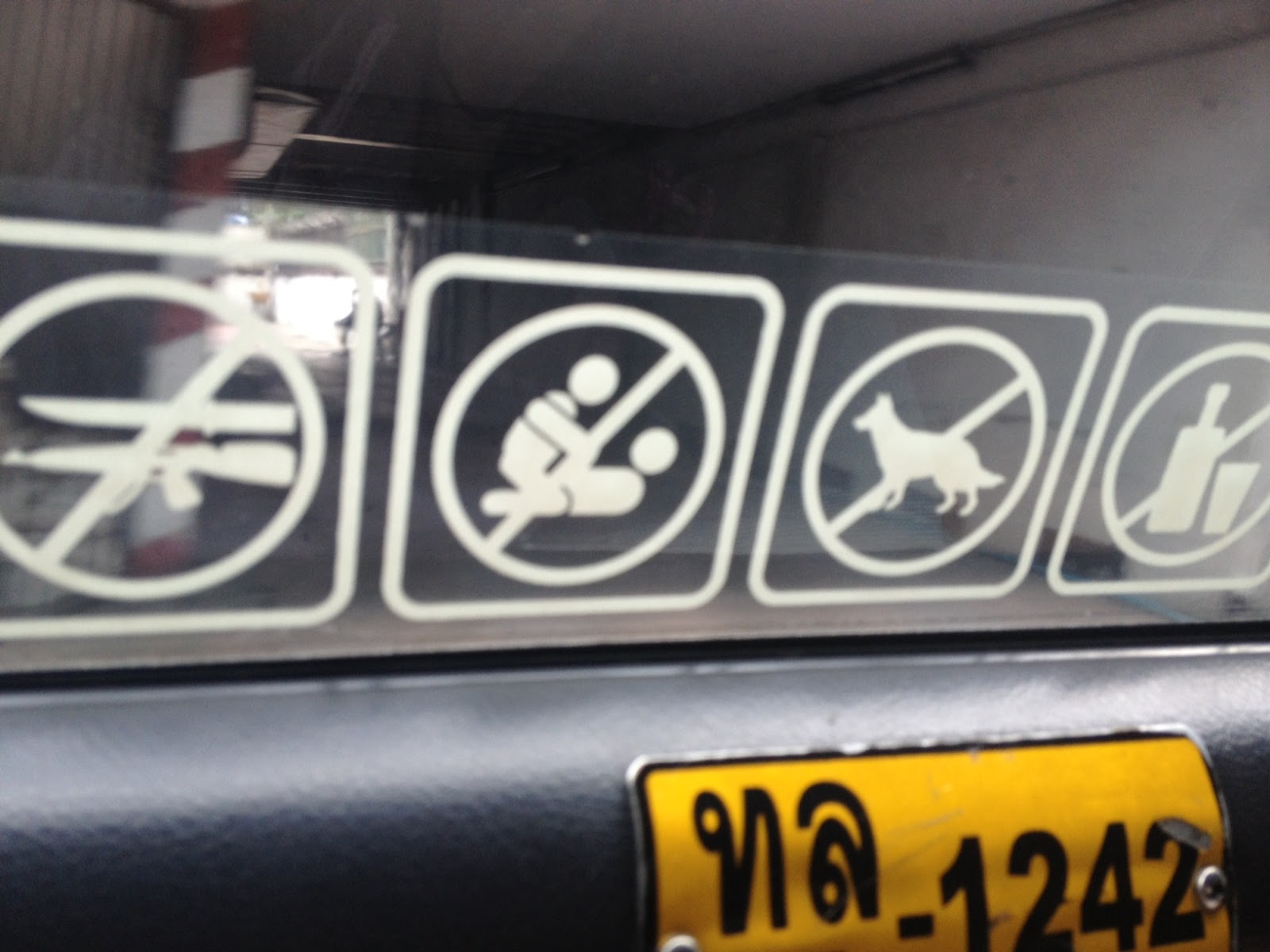 These vinyl decals were plastered on the window in the taxi I rode with my kids today indicating appropriate taxi etiquette for that particular car.