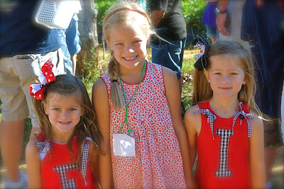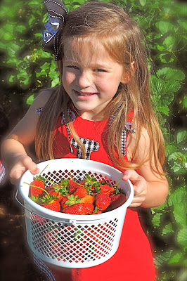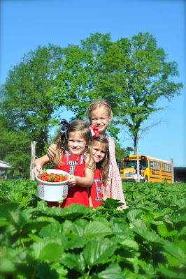 The girls look so cute in their outfits and bows! They are marvelous pickers. Nice sized strawberries too. Yum!