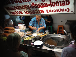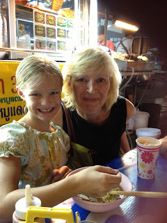 Since we werent sure about going-it alone, Susan (bravely) volunteered to escort us to a “reputable” place where she guarantees we wont get sick from! This is how all the Thai’s eat. Little make-shift stands on the side of the road. Vehicle pollution and motorbikes whizzing by add to the “ambiance”. Stools around rickety tables. Plates are rinsed, but not heat-santitized and probably not soaped up. You can be sure I prayed over the food!! You can fill your belly on a shoestring budget this way…..that is IF you are feeling brave enough for squid and prawns.