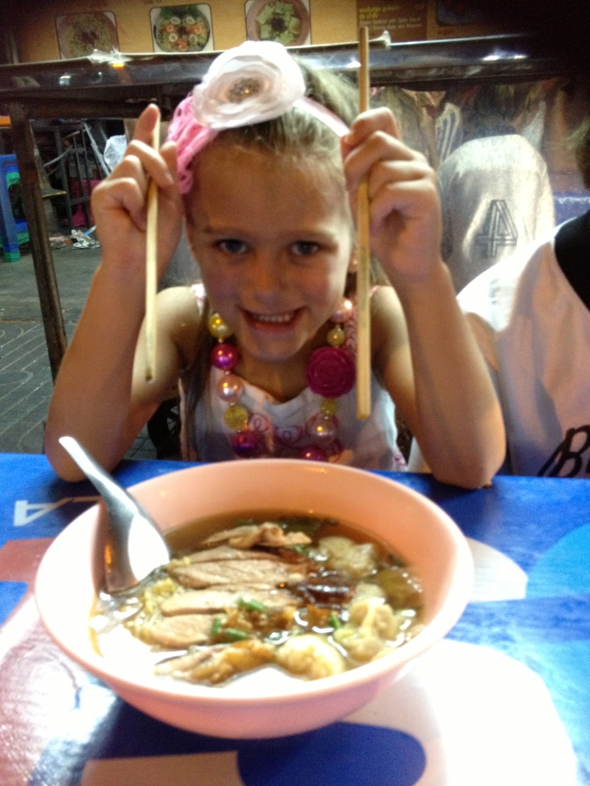 Eating noodle soup with chop-sticks…..now that takes special talent! (which my 5-year-old does not possess:)
