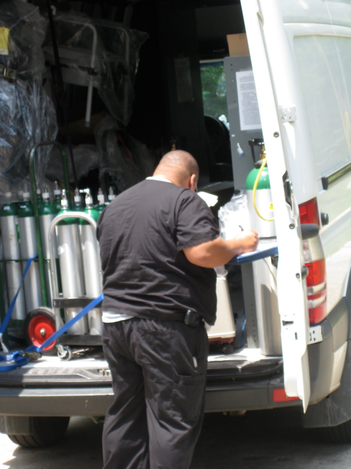 A home health care consultant bringing in a sleep apnea monitor, oxygen compressor and tanks, portable and permanent pulse ox monitors, alarms, bells and whistles.